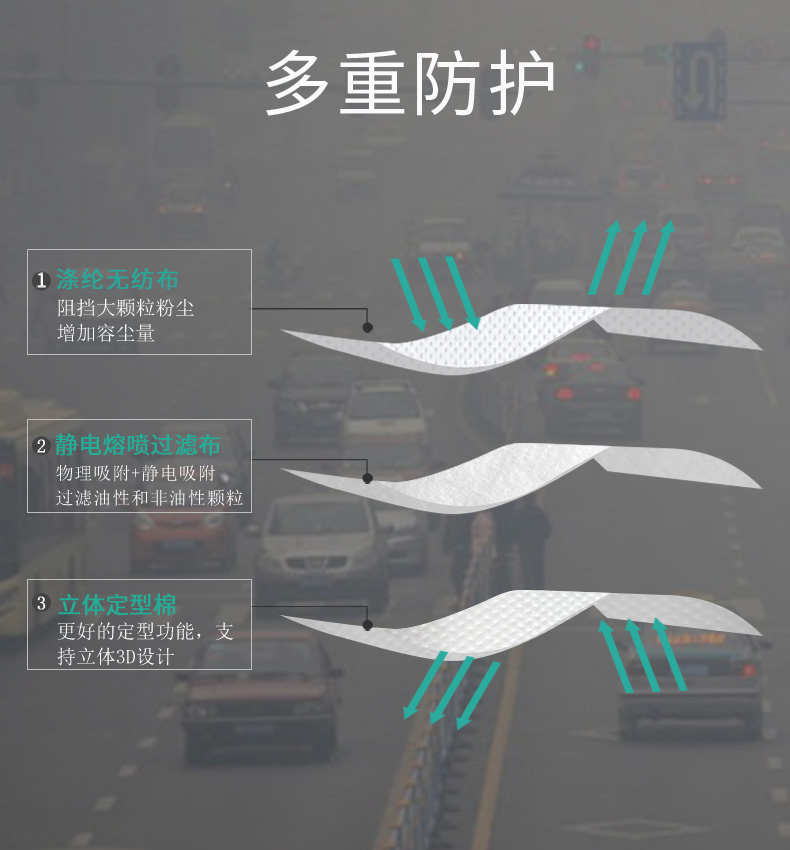 而经过静电处理的无纺布不仅可以 阻挡大粉尘颗粒,而且附在其表面的静电荷可以通过静电引力将细小粉尘吸附住,达到很高的阻尘效率。而滤料的厚度却很薄,大大降低了使用者的呼吸阻力,并感到舒适,从而达到了我们前面所提到的好的滤料的三个必要条件。有了好的滤 料,配合科学设计的面具结构,就构成了一个高效优质的口罩了,它能使您感到使用方便,舒适,并能真正地保护您的健康。
